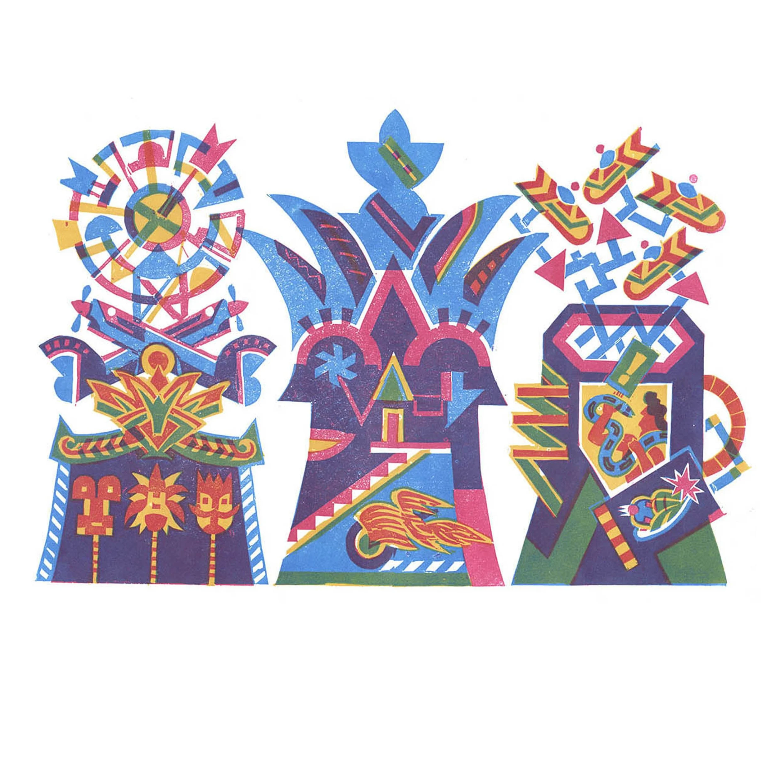 An unframed three colour linocut print.